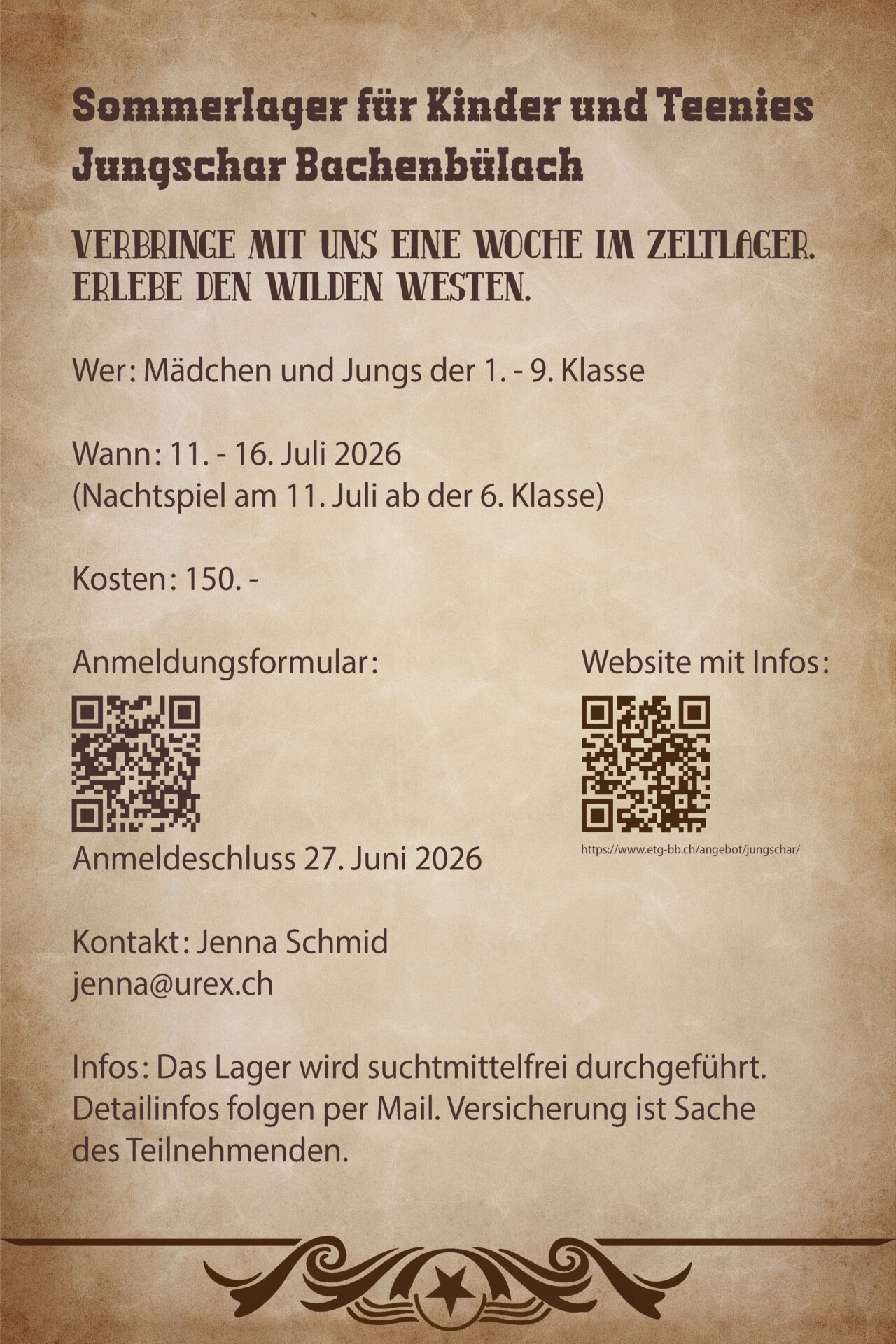 Diesen Samstag, 6. September 2025, findet in Zusammenarbeit mit dem Dorf Bachenbülach, der Jungschar und weiteren Gruppen ein Kinder- und Jugendtag statt.